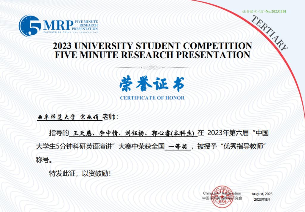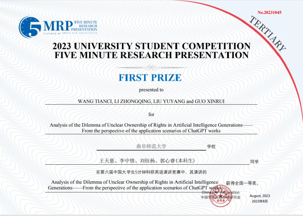 日前,第六届中国大学生5分钟科研英语演讲竞赛决赛(非医科类)在同济大学成功举行。由华体会在线选拔推荐的16支团队取得优异成绩,获得全国一等奖1项、二等奖6项、三等奖9项。其中,由王天慈、李中情、刘钰杨、郭心睿等四位同学组成的团队作品“Analysis of the Dilemma of Unclear Ownership of Rights in Artificial Intelligence Generations — From the perspective of the application scenarios of ChatGPT works”荣获全国一等奖。此外,其他16支参赛队伍分获校级一、二、三等奖。宋兆娟、李梦实等25位老师荣获优秀指导教师奖。