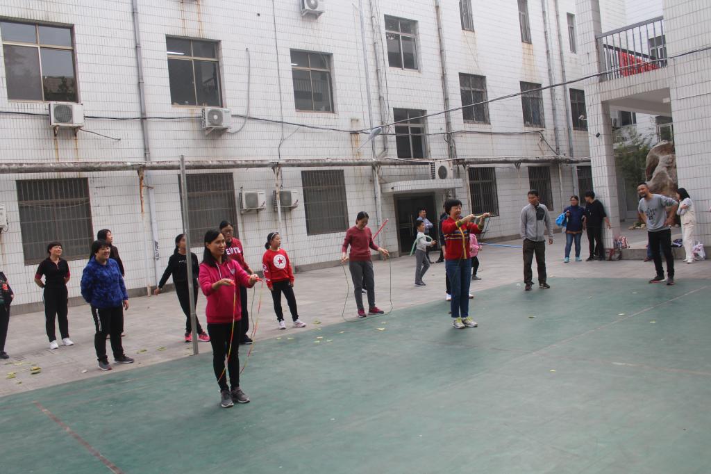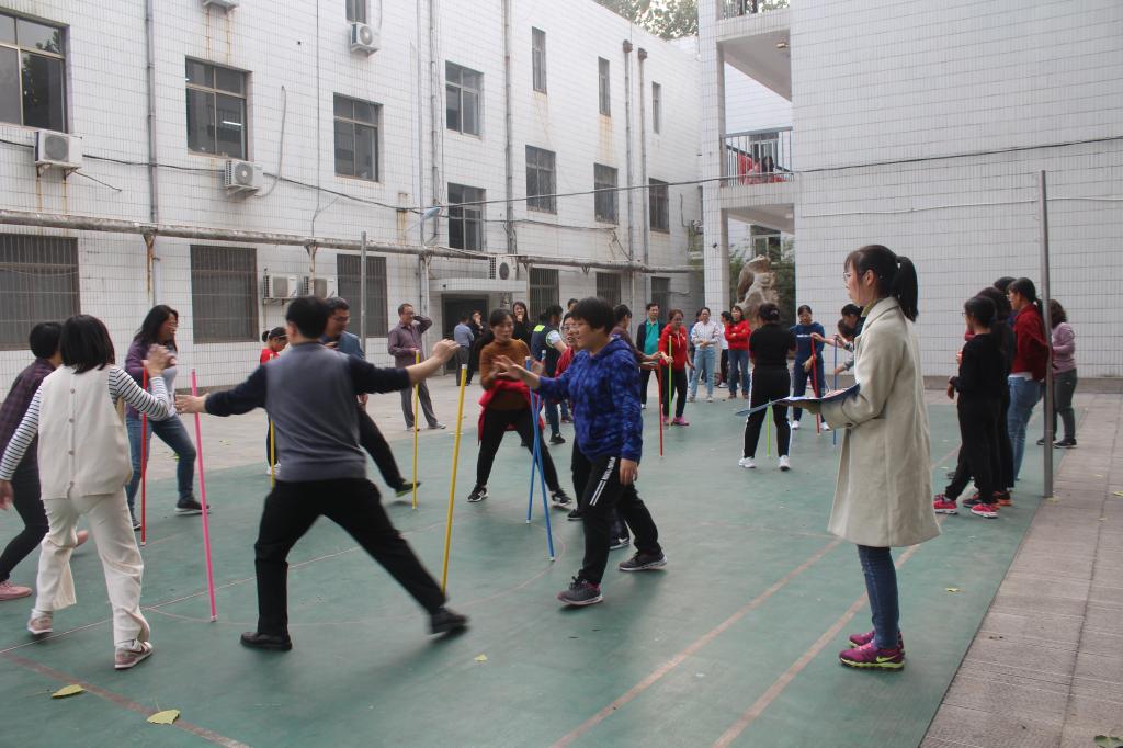 本次运动会的四个项目都是集体项目,集体项目考验的是团队协作能力,特别是新增加的接力跳绳和不倒森林,使得比赛更加热烈紧张。接力跳绳比赛中,平时忙于备课站讲台的老师们各显身手,跳起绳来身轻如燕, “谁怕谁”队创造了3分钟跳绳483个的最佳成绩。不倒森林是团结集体、考验耐心、锻炼默契协作的游戏,参与者每人持一根活动杆围成一个圆,仅能用手掌支撑活动杆绕圈前进,在保证自己的直立杆不倒的前提下,迅速移动步伐将掌心按到相邻的活动杆上,保证杆不倒,3分钟内活动杆不倒的次数多者取胜。此项比赛看起来简单,做起来却不是那么容易,从赛前短暂练习,到比赛中的手忙脚乱,发展到配合紧密、口号和动作一致,既锻炼了老师们的合作精神,又增加了比赛的趣味性和互动性。