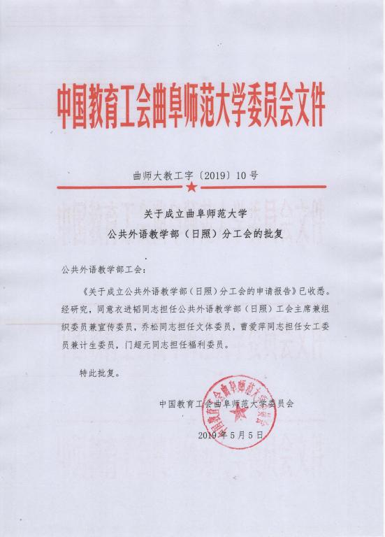 曲师大教工字〔2019〕10号关于成立华体会在线华体会在线(中国)(日照)分工会的批复