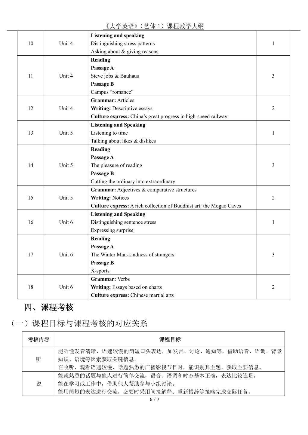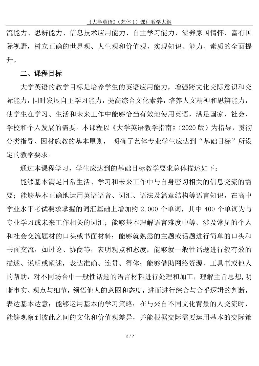 大学英语(艺体1)课程教学大纲(2022版)