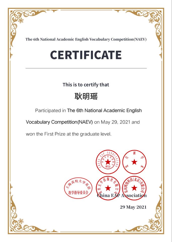 近日,由中国学术英语教学研究会、上海高校大学英语教学指导委员会、复旦大学出版社主办,曲师大华体会在线(中国)和曲园学术英语社团承办的“第六届全国大学生学术英语词汇竞赛”圆满结束。继去年我校两名学子获全国一等奖后,本次大赛,十名曲园学子再次获得全国一等奖。