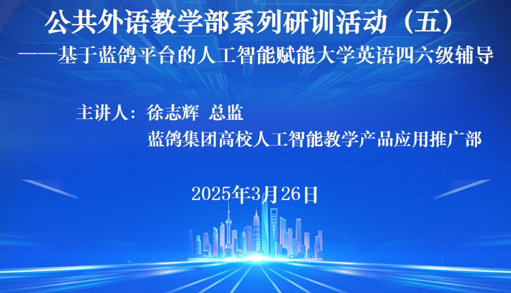 3月26日下午,华体会在线(中国)举办2024-2025学年春季学期第五场全员研训活动,本次研训以“基于蓝鸽平台的人工智能赋能大学英语四、六级辅导” 为主题,邀请蓝鸽集团有限公司高校人工智能教学产品应用推广部总监徐志辉作专题讲座,进行技术应用辅导,华体会在线(中国)全体教师参加了本次研训活动。